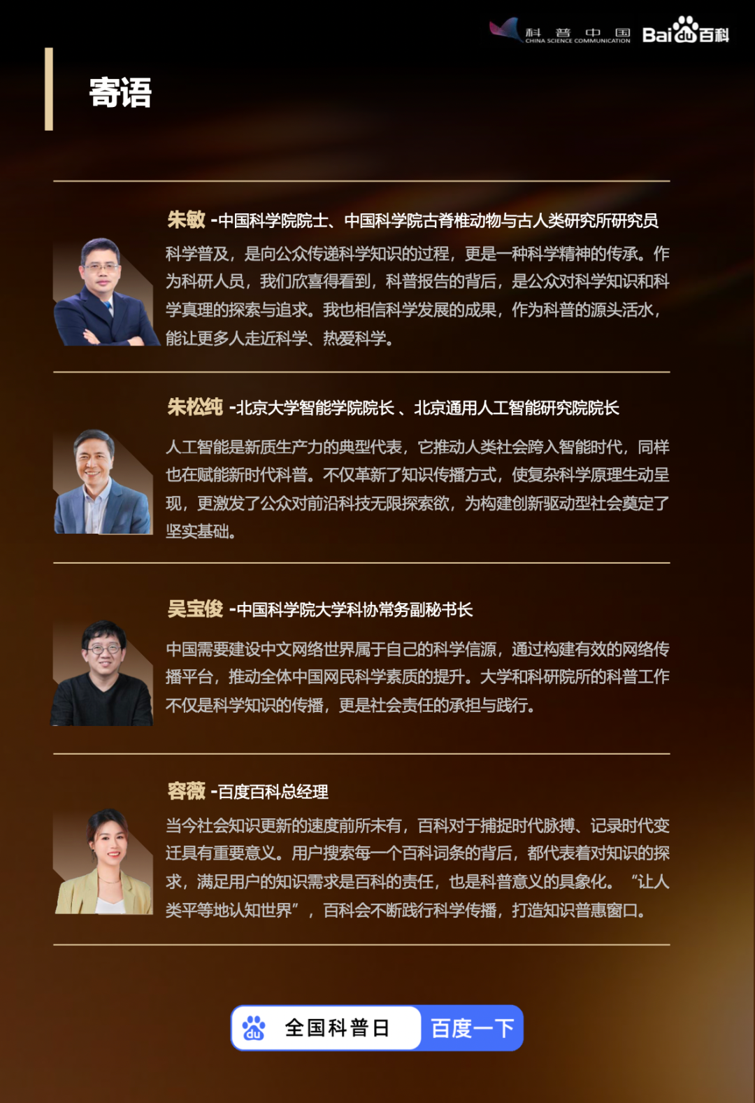 总经理容薇提到:“用户搜索每一个百科词条的背后,都代表着对知识的探求,满足用户的知识需求是百科的责任,也是科普意义的具象化。”从过去一年用户关注的词条不难看出,对于科普内容的专业性、权威性、全面性。正是这样一个个的词条,共同推进了人类社会的跨越,激发公众对于科技的探索欲。
